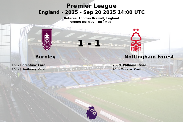The match was characterized by possession favoring Nottingham Forest (63%) and a greater number of shots (16 against Burnley’s 11). Despite this, Burnley proved solid in defense. The match also had moments of tension, reflected in the yellow cards shown to Florentino for Burnley and Morato for Nottingham Forest. Statistically, Burnley had 37% possession, 11 shots (5 on target, 4 off), 4 corners, 12 fouls, 1 yellow cards, None red cards while Nottingham Forest had 63% possession, 16 shots (7 on target, 2 off), 5 corners, 11 fouls, 1 yellow cards, None red cards. Referee Thomas Bramall officiated the match firmly. The match corresponding to matchday 5 of the 2025 Premier League promises to be remembered for its intensity and parity.