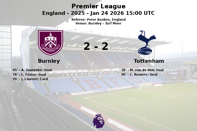 In the second half, L. Foster put Burnley ahead in the 76th minute. Just when it seemed victory would remain at home, C. Romero appeared in the 90th minute to equalize for Tottenham, assisted by W. Odobert, sealing the final score.