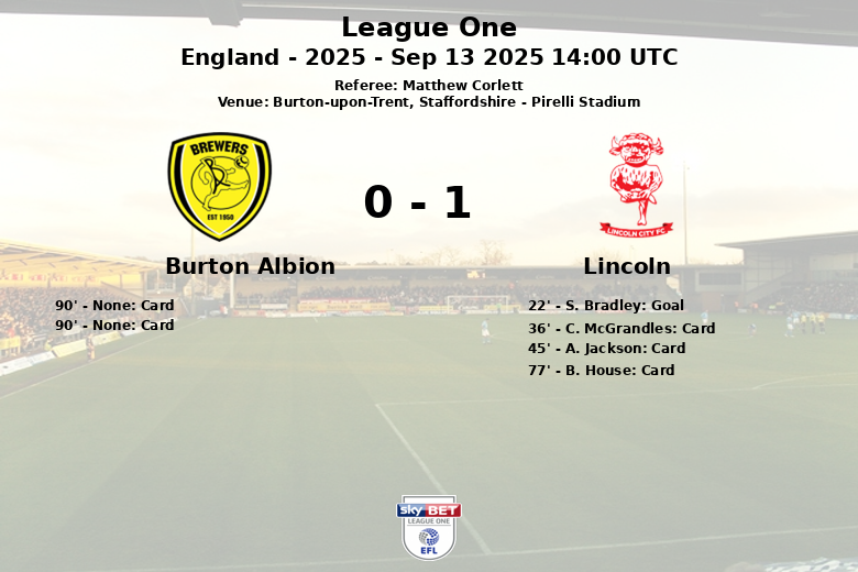 Burton-upon-Trent, Staffordshire – Lincoln City secured all three points from the Pirelli Stadium in a hard-fought match against Burton Albion. Despite Burton Albion’s dominance in possession (65%), it was Lincoln who managed to capitalize on their opportunity in the 22nd minute, with a goal by S. Bradley following an assist from T. Bayliss.