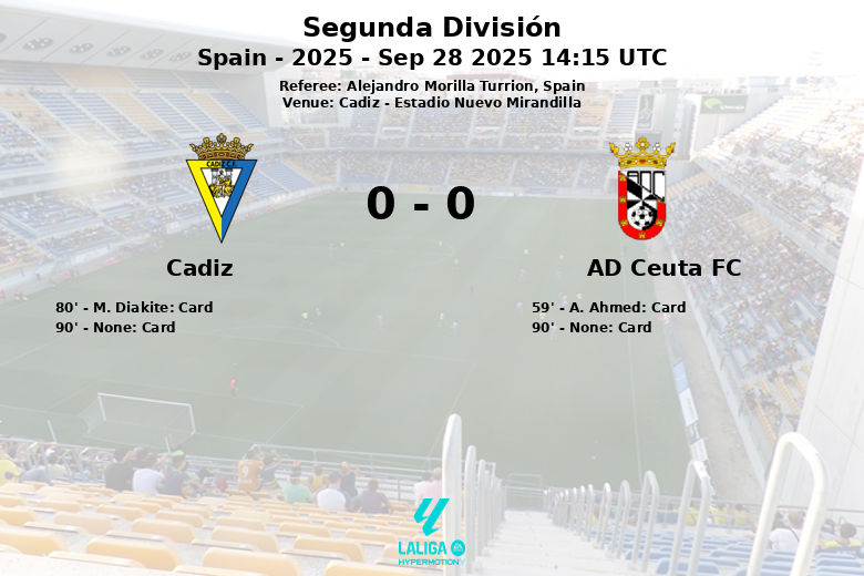 AD Ceuta FC led in total shots (11 compared to Cádiz’s 8), but accuracy was similar, with three shots on target for each side. On-field discipline was reflected in the yellow cards, with one for each side. The match was characterized by physical play, evidenced by the 14 fouls committed by AD Ceuta FC and 10 by Cádiz. Referee Alejandro Morilla Turrion was attentive to infractions, showing yellow cards to A. Ahmed of AD Ceuta FC in the 59th minute, and M. Diakite of Cádiz in the 80th minute. The end of the match was also marked by additional yellow cards to both teams in the 90th minute.