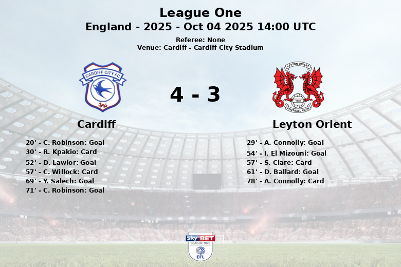 Leyton Orient took the lead for the first time in the match in the 61st minute with a goal from D. Ballard. Cardiff did not give up and Y. Salech equalized the match in the 69th minute, with an assist from R. Colwill. The excitement continued and C. Robinson scored again for Cardiff in the 71st minute, putting the score at 4-3. Despite final efforts, the score did not move again.