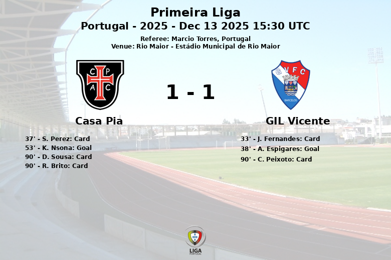 Espigares put Gil Vicente ahead in the 38th minute, but Nsona equalized for Casa Pia in the 53rd minute. Despite the attempts of both teams to break the tie, the score did not move further, sealing a draw that leaves both teams with one point in this round of the Primeira Liga.