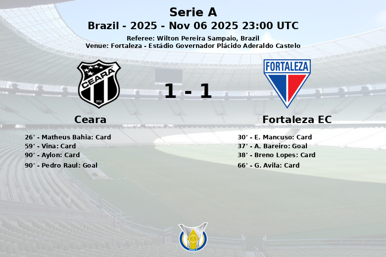 The match was marked by several yellow cards, with Matheus Bahia, Vina, and Aylon being booked for Ceará, while E. Mancuso, Breno Lopes, and G. Avila received yellow cards for Fortaleza EC. Ceará’s insistence finally paid off in the 90th minute, when Pedro Raul, after a great pass from Marcos Victor, equalized the score, silencing the stadium and securing a valuable point for his team. The referee was Wilton Pereira Sampaio.