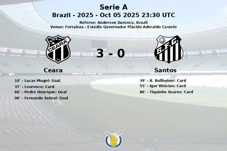 In the second half, Ceara continued to be more effective. Pedro Henrique extended the lead in the 66th minute with an assist from A. Galeano. Santos tried to react, but Ceara’s defense remained solid. In stoppage time, in the 90th minute, Fernando Sobral sealed the match with a third goal, assisted by Pedro Henrique, consolidating a memorable victory for the home team.