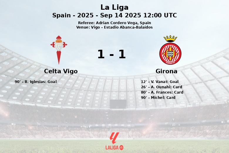 Vigo, Spain – In a hard-fought match at the Estadio Abanca-Balaídos, Celta Vigo and Girona drew in a game that kept fans on the edge of their seats. Girona took the lead in the 12th minute thanks to a goal by V. Vanat, assisted by I. Martin. The match was marked by intensity, with several yellow cards shown, first to A. Ounahi of Girona in the 26th minute, and later to A. Frances and coach Michel, also of Girona, in the 80th and 90th minutes respectively. Despite having only 40% possession, Girona remained solid in defense. Celta, dominating possession with 60% and creating more goal opportunities (20 shots compared to Girona’s 13), fought tirelessly for the equalizer. Finally, in the 90th minute, B. Iglesias converted a penalty for Celta, sealing the draw and splitting the points. The match, refereed by Adrian Cordero Vega, left a bittersweet feeling for both teams, with Girona regretting not being able to maintain their lead and Celta celebrating a late draw at home.
