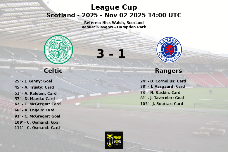 The match remained precariously balanced until the final minutes, when Celtic’s C. McGregor scored a crucial goal in the 93rd minute, putting his team back in the lead. Rangers didn’t give up and fought tirelessly, but C. Osmand sealed the victory for Celtic in the 109th minute with a goal assisted by K. Tierney. The match referee, Nick Walsh, had a busy afternoon, issuing several yellow cards to both teams. Ultimately, Celtic advanced to the League Cup final in a match that will be etched in the memory of fans.
