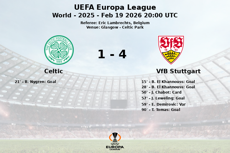Glasgow, Scotland – VfB Stuttgart secured a commanding victory over Celtic in the first leg of their UEFA Europa League Round of 32 tie at Celtic Park. Despite Celtic’s slight edge in possession (51% to 49%), Stuttgart proved more clinical in front of goal.