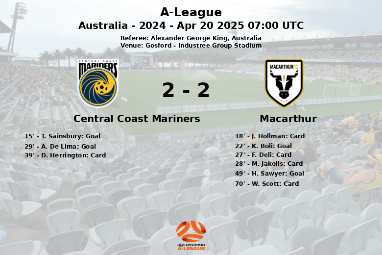 The match was marked by a succession of goals and yellow cards. Tom Sainsbury opened the scoring for the Mariners in the 15th minute, assisted by A. McCalmont. Kye Boli equalized for Macarthur in the 22nd minute, assisted by M. Jakolis. Just five minutes later, A. De Lima put the Mariners back in the lead (29′). However, Macarthur equalized again thanks to a goal by H. Sawyer in the 49th minute, also assisted by M. Jakolis. The match finished 3-3 after another goal from each team in the first half.