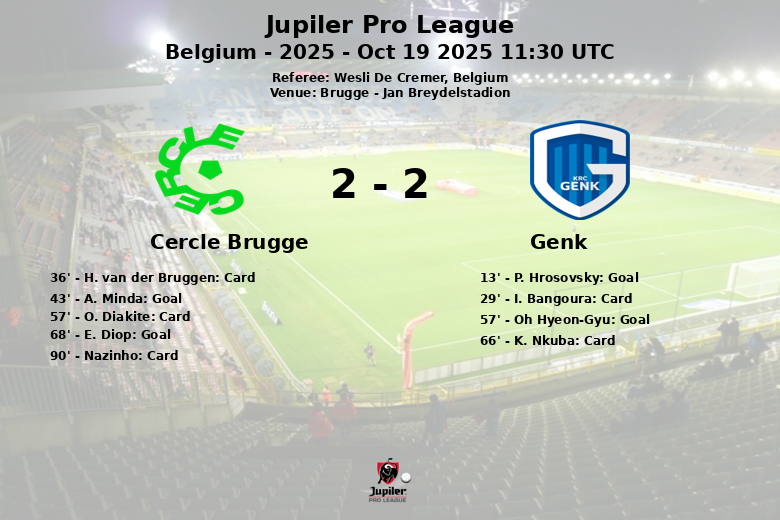 Brugge, Belgium – In a hard-fought match at the Jan Breydelstadion, Cercle Brugge and Genk played to a draw in an encounter full of emotions and back-and-forth action. Genk took an early lead thanks to a goal by P. Hrosovsky in the 13th minute, assisted by Oh Hyeon-Gyu. Cercle Brugge responded before halftime with a goal by A. Minda in the 43rd minute, assisted by G. Magnee, leveling the score.