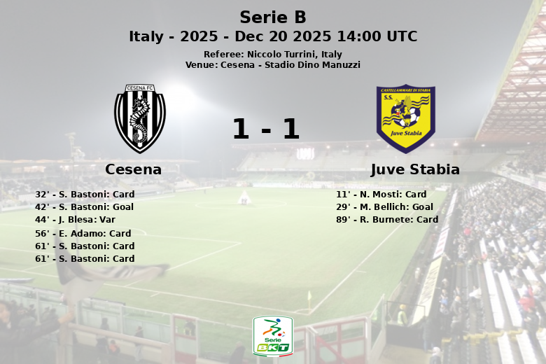 Cesena, Italy – In a match filled with emotion and controversy, Cesena and Juve Stabia drew at the Stadio Dino Manuzzi on matchday 17 of Serie B. Juve Stabia took the lead in the 29th minute thanks to a goal by M. Bellich, assisted by F. Maistro. The goal sparked euphoria on the visitors’ bench and forced Cesena to react.