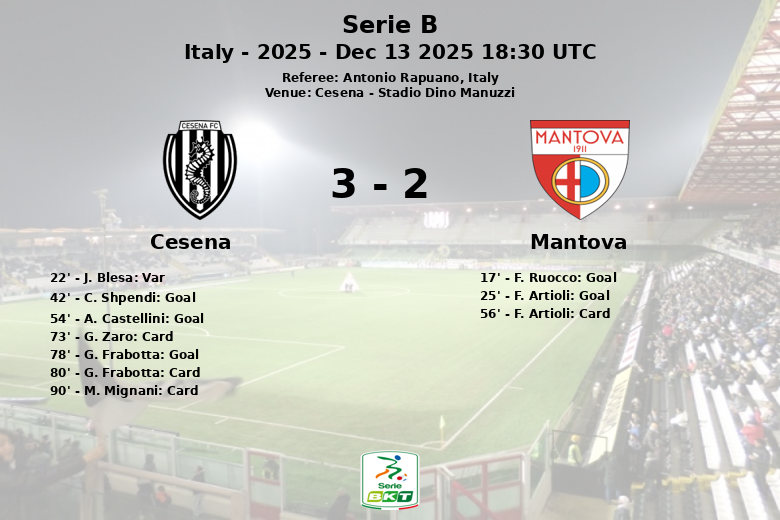 Mantova surprised by opening the scoring in the 17th minute with a penalty converted by F. Ruocco. Shortly after, in the 22nd minute, a goal by J. Blesa for Cesena was disallowed for offside after a VAR review. Mantova’s joy extended when F. Artioli scored a goal from open play in the 25th minute, extending the lead.