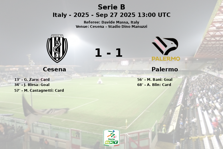 Cesena took the lead in the 34th minute thanks to a goal from J. Blesa, after an offensive play. However, Palermo responded in the second half, with a goal from M. Bani in the 56th minute, after an assist from T. Augello.