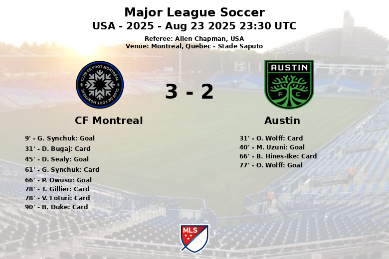 The second half continued with intensity. P. Owusu extended Montreal’s lead in the 66th minute with a penalty goal. Austin did not give up, and O. Wolff scored in the 77th minute, keeping the score close until the end. The match was marked by numerous fouls, with 15 committed by Montreal and 11 by Austin, resulting in several yellow cards for both teams. Despite the parity in ball possession, Montreal demonstrated greater effectiveness in attack, with 7 shots on target compared to Austin’s 5. Referee Allen Chapman had a busy night at Stade Saputo.