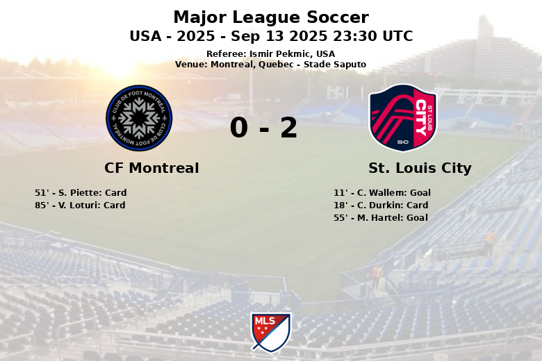 The first half also saw a yellow card for C. Durkin of St. Louis City in the 18th minute. In the second half, the intensity remained high, and in the 51st minute, S. Piette of CF Montreal received a yellow card. St. Louis City’s pressure paid off again in the 55th minute when M. Hartel extended the lead, solidifying the visitors’ dominance.