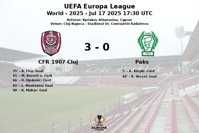 Cluj-Napoca witnessed a vibrant UEFA Europa League match where CFR 1907 Cluj secured a victory against Paks. The game, played at Stadionul Dr. Constantin Rădulescu under the refereeing of Cypriot Kyriakos Athanasiou, saw Cluj dominate the scoreboard with a decisiveness that reflected their superiority in key moments.