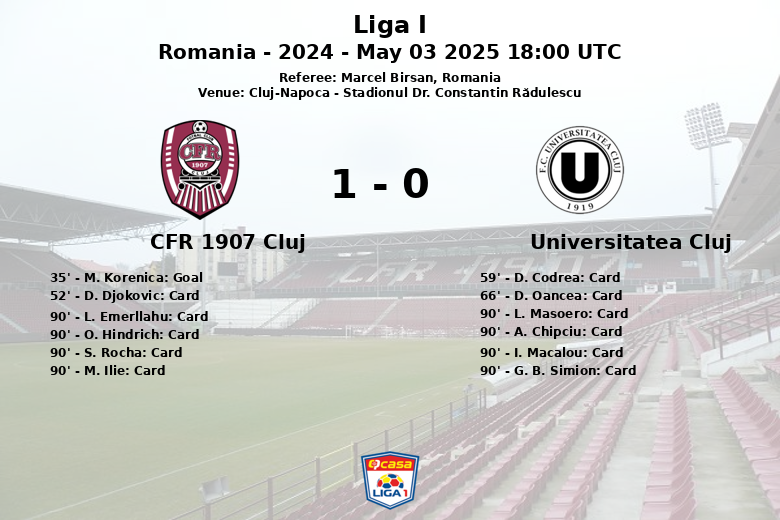 Cluj-Napoca, May 3, 2025.- CFR 1907 Cluj secured a 1-0 win against Universitatea Cluj in a tightly contested Liga I Championship Round match, played at the Stadionul Dr. Constantin Rădulescu. Referee Marcel Birsan oversaw a game marked by its intensity and a flurry of yellow cards.