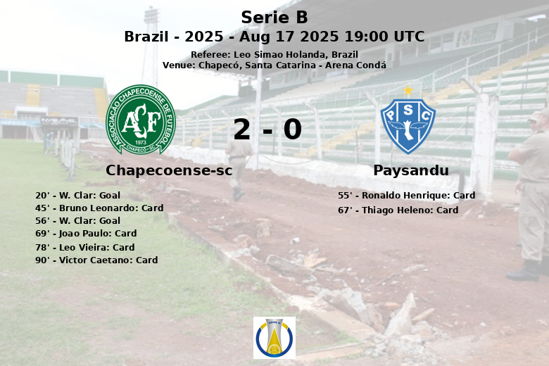 W. Clar was the outstanding figure of the match, scoring both goals for Chapecoense-sc. The first came in the 20th minute, after an assist from Mailton, opening the scoring and giving the home team the lead. Clar scored again in the 56th minute, extending the lead for Chapecoense-sc.