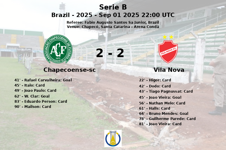 The second half continued with intensity. W. Clar extended the lead for Chapecoense-SC by scoring a penalty in the 62nd minute. But Vila Nova did not give up and Bruno Mendes equalized in the 64th minute, after an assist from Guilherme Parede. The match was affected by the high number of fouls (10 by Chapecoense-SC and 23 by Vila Nova) and the numerous cards: 3 yellow and one red for the home team, and 7 yellow for the visitors. Eduardo Person of Chapecoense-SC was sent off in the 83rd minute. Despite the final efforts, the score did not change, sealing the draw.