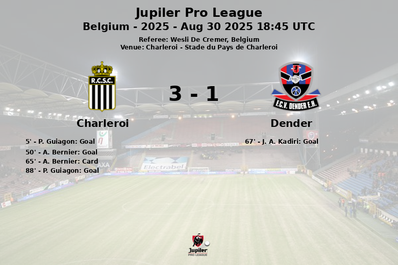 Charleroi opened the scoring early, in the 5th minute, with a goal from P. Guiagon from a penalty kick. In the second half, A. Bernier extended Charleroi’s lead in the 50th minute. However, Dender did not give up and narrowed the gap in the 67th minute through J. A. Kadiri. Just when it seemed that Dender could equalize, P. Guiagon scored again in the 88th minute, sealing the victory for Charleroi.