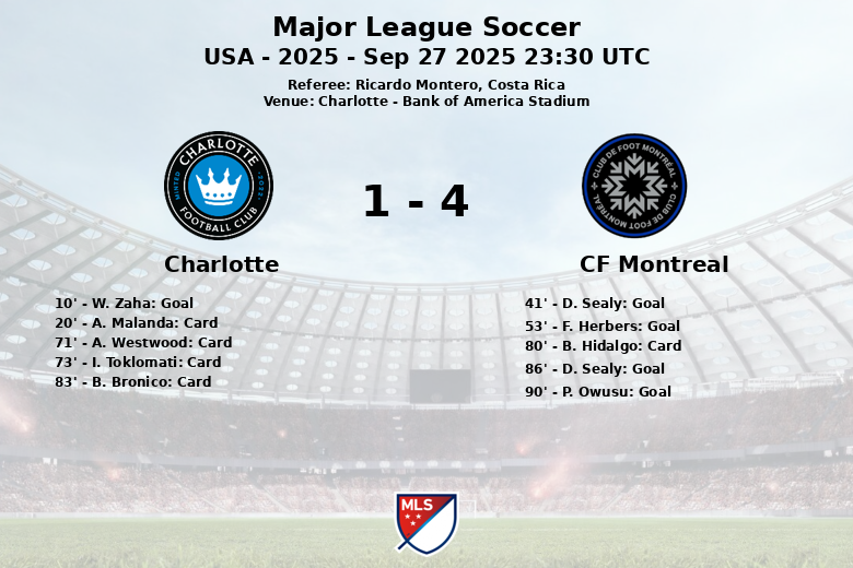 In the second half, CF Montreal consolidated its dominance with goals from F. Herbers in the 53rd minute, another goal from D. Sealy in the 86th minute, and finally, a goal from P. Owusu in stoppage time, in the 90th minute. Charlotte showed frustration, accumulating several yellow cards during the match. Referee Ricardo Montero, from Costa Rica, had a busy night sanctioning numerous fouls (17 for Montreal and 9 for Charlotte) and issuing four yellow cards to the home team and one to the visitor.
