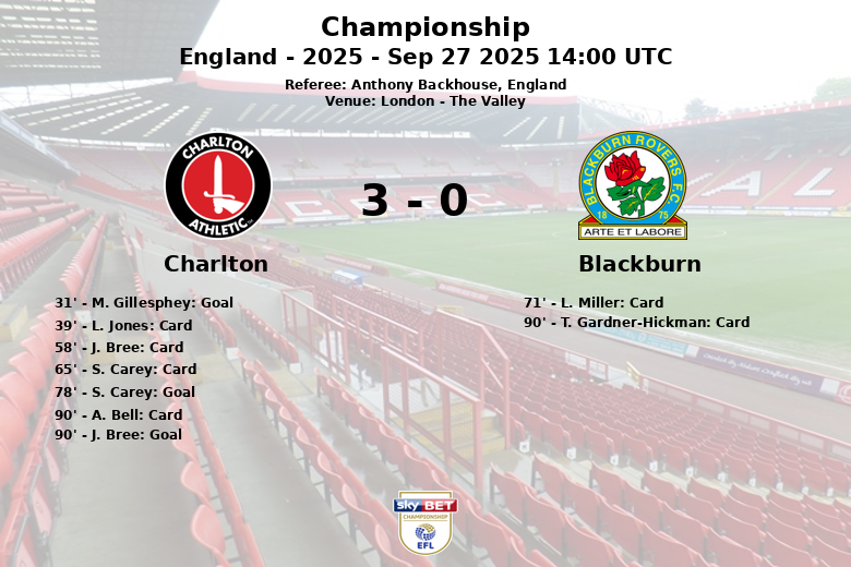 Charlton Athletic secured a commanding victory over Blackburn Rovers in a match played at The Valley in London, with a final score of 3-0. The game, part of Week 7 of the 2025 Championship season, was officiated by referee Anthony Backhouse.