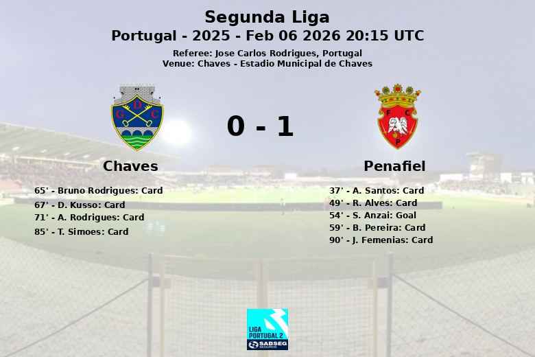 From then on, the match was characterized by a series of yellow cards, four for Chaves (Bruno Rodrigues, D. Kusso, A. Rodrigues and T. Simoes) and one more for Penafiel (B. Pereira and J. Femenias near the end of the match). Despite Chaves’ efforts to equalize, Penafiel managed to maintain the lead until the final whistle.