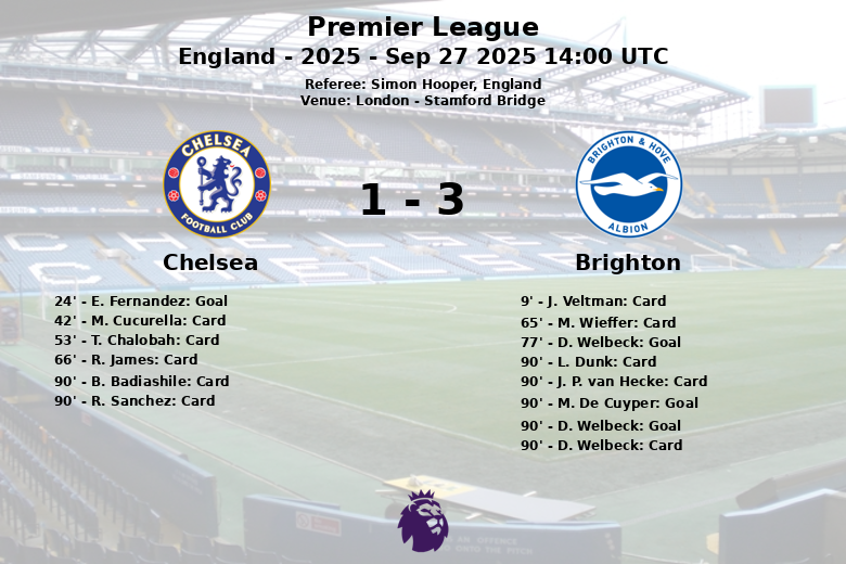 London, England – In a match filled with tension and cards, Brighton & Hove Albion secured a significant away victory over Chelsea at Stamford Bridge. The game, corresponding to the sixth matchday of the Premier League, ended with a score of 3 to 1 in favor of the visitors.