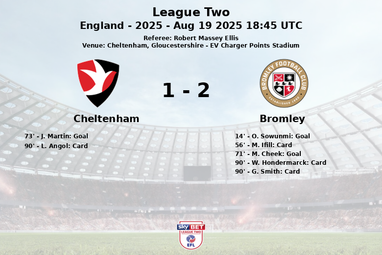 The match became tense in the final minutes, with several yellow cards shown to both teams in stoppage time, including L. Angol for Cheltenham and W. Hondermarck and G. Smith for Bromley.