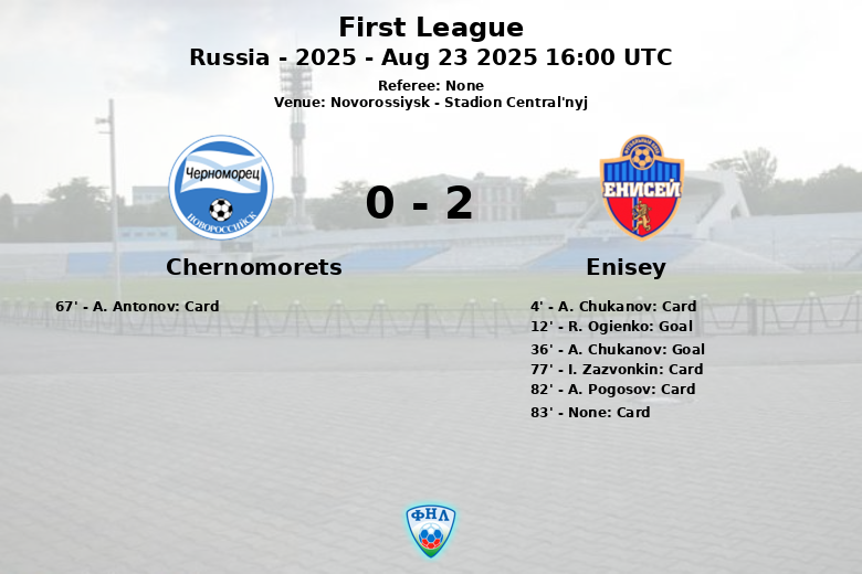 Novorossiysk, Russia – In a match held at the Stadion Central’nyj, Enisey managed to overcome Chernomorets in the 6th round of the First League. The game, played under the watchful eyes of the fans, was decided by goals from R. Ogienko in the 12th minute and A. Chukanov in the 36th minute.
