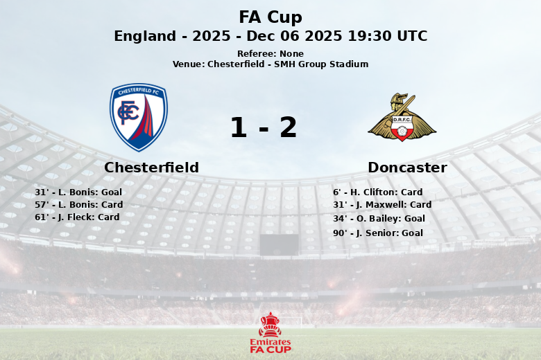 The first half was marked by high tension, reflected in the yellow cards shown to H. Clifton and J. Maxwell of Doncaster in the 6th and 31st minutes respectively. L. Bonis of Chesterfield opened the scoring in the 31st minute, but the home side’s joy was short-lived as O. Bailey of Doncaster equalized in the 34th minute with an assist from L. Molyneux.