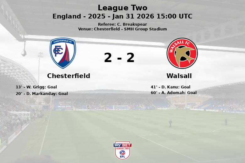 Chesterfield quickly took the lead thanks to goals from W. Grigg in the 13th minute and D. Markanday in the 20th minute, giving the impression that they would take control of the match. However, Walsall reacted with a goal from D. Kanu in the 41st minute, reducing the difference before halftime.