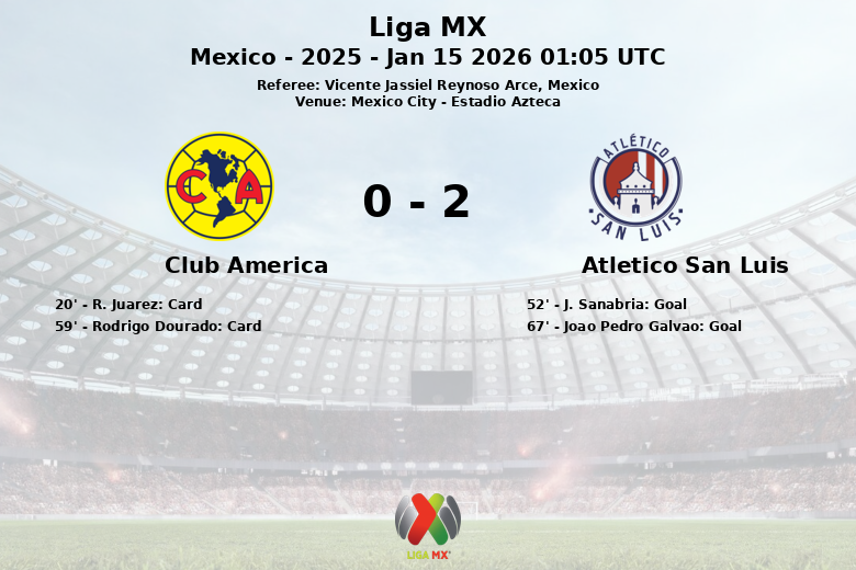 Mexico City – In a match held at the Estadio Azteca, Atletico San Luis defeated Club America with a score of 2 to 0. The match, corresponding to Matchday 2 of the Liga MX Clausura, was marked by the early expulsion of an America player in the 20th minute.