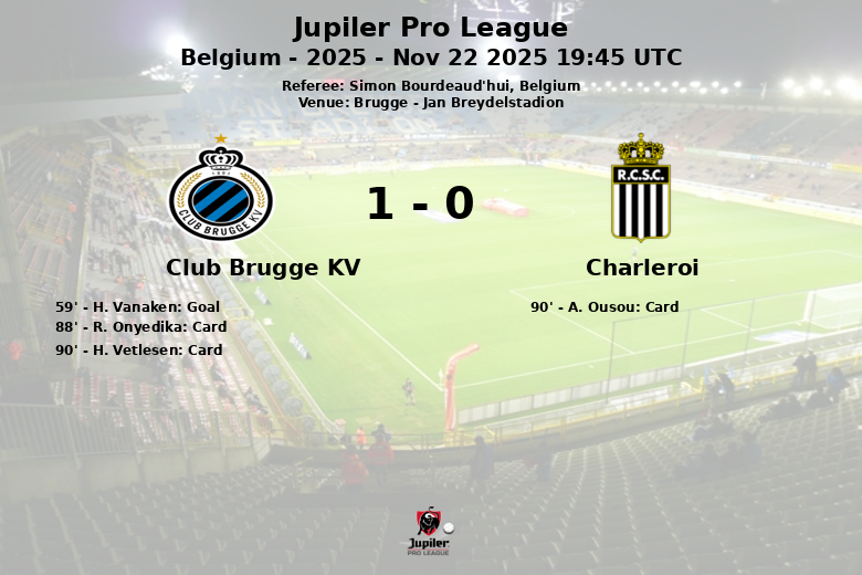 Brugge, Belgium – In a match held at the Jan Breydelstadion, Club Brugge KV triumphed over Charleroi in a game corresponding to matchday 15 of the Jupiler Pro League. The sole goal of the match came in the 59th minute, scored by H. Vanaken with an assist from J. Seys, giving the home team the decisive lead.