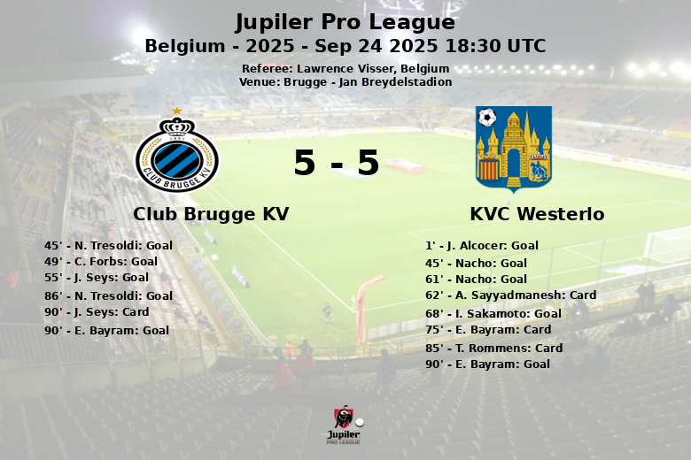 However, Brugge did not give up. N. Tresoldi pulled one back before the end of the first half, and after the restart, C. Forbs and J. Seys turned the score around. Just when it seemed that Brugge was in control, Nacho scored again for Westerlo, leveling the match. I. Sakamoto put Westerlo ahead again, but Brugge, with a dominant 71% possession, fought until the end.