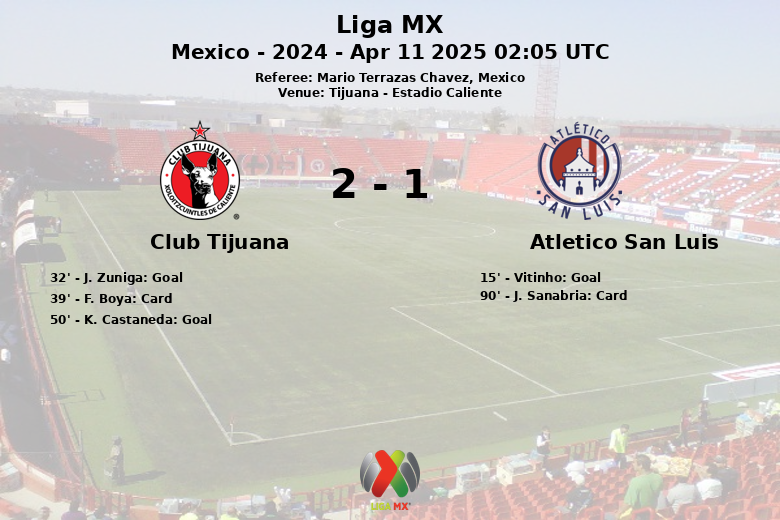 Club Tijuana secured a 2-1 victory over Atlético de San Luis in an exciting match played at the Estadio Caliente in Tijuana. Despite Atlético de San Luis controlling possession (71%), the home side proved more clinical in front of goal. Vitinho opened the scoring for Atlético de San Luis in the 15th minute, but Tijuana responded with goals from J. Zúñiga in the 32nd minute and K. Castañeda in the 50th, securing their win. The match was characterized by Tijuana’s higher number of shots on target (7) compared to their opponent’s 4, and featured several yellow cards (one for each team). Despite Atlético de San Luis’ territorial dominance, Tijuana’s superior shooting accuracy proved decisive in securing the victory. A thrilling match kept fans on the edge of their seats until the final whistle.
