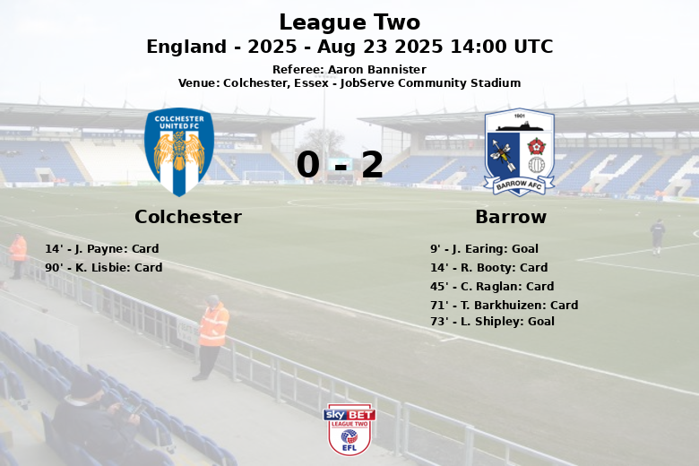 In the second half, Barrow consolidated their lead in the 73rd minute with a goal by L. Shipley, following an assist from C. Raglan. Despite Colchester’s persistence in the final stretch and their 11 corners, the home team failed to reduce the deficit. Referee Aaron Bannister added more cautions to the scoreboard, showing yellow cards to T. Barkhuizen and K. Lisbie before the final whistle.