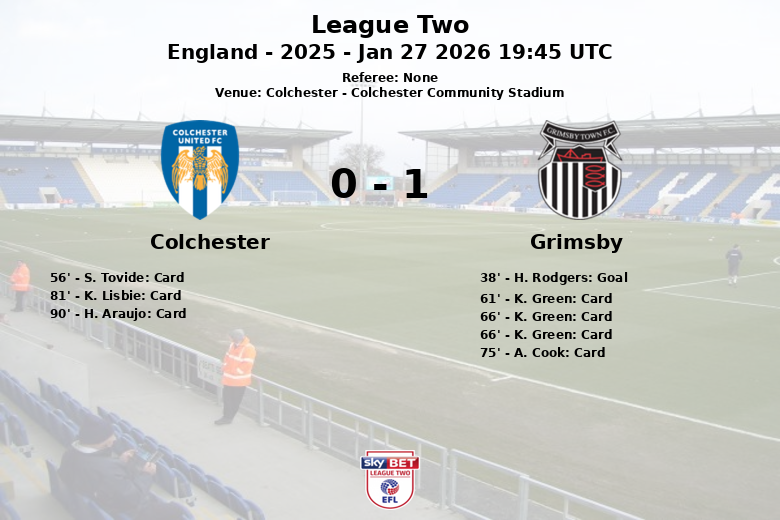 The second half was marked by a series of yellow cards for both teams, highlighting the tension on the field. The situation became even more complicated for Grimsby when K. Green received a second yellow card in the 66th minute, resulting in his expulsion from the match. Despite playing with ten men for the final part of the match, Grimsby managed to maintain their lead and secure the three points. Colchester, despite their efforts and numerous shots, could not find a way to beat the rival goalkeeper.