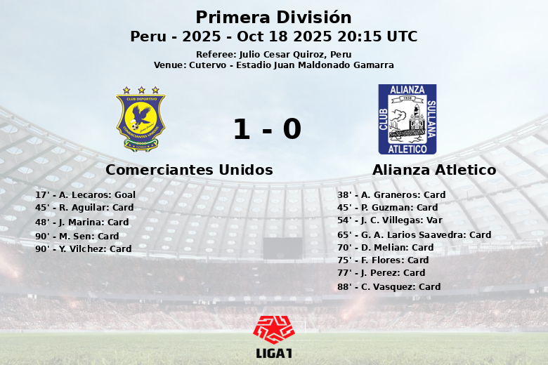 Cutervo hosted a hard-fought and physical match between Comerciantes Unidos and Alianza Atletico, corresponding to Matchday 15 of the Clausura in the Peruvian Primera División. The home team, Comerciantes Unidos, secured the victory thanks to a goal by A. Lecaros in the 17th minute, assisted by W. Guzman.
