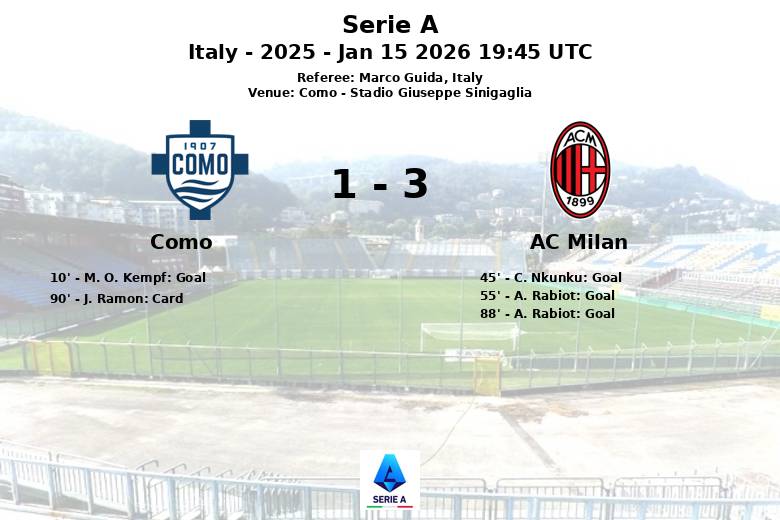 Como, Italy – In a Serie A match held at the Stadio Giuseppe Sinigaglia, AC Milan defeated Como with a score of 3 to 1. The match, played on January 15, 2026, saw Como dominate possession with 68%, but AC Milan’s effectiveness proved decisive.