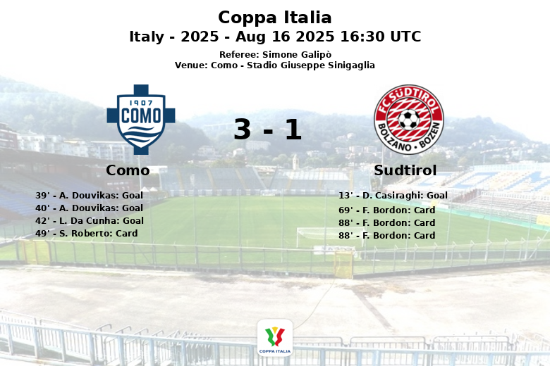 Forward A. Douvikas emerged as the star of the match, scoring two consecutive goals in the 39th and 40th minutes, both assisted by M. Vojvoda and J. Rodriguez respectively. Como’s offensive onslaught continued with a goal from L. Da Cunha in the 42nd minute, solidifying a lead that Sudtirol could not overcome.