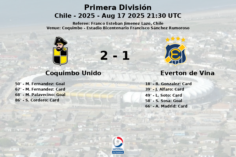 The first goal of the match came in the 50th minute when M. Fernández of Coquimbo Unido, assisted by C. Zavala, opened the scoring. Everton reacted quickly, and in the 58th minute, S. Sosa equalized the match through a penalty. The parity did not last long, as M. Palavecino of Coquimbo Unido scored in the 68th minute, giving his team the definitive advantage.