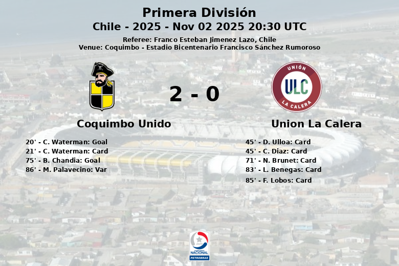 In the second half, B. Chandia extended Coquimbo’s lead in the 75th minute, assisted by N. Johansen. A goal by M. Palavecino was disallowed by VAR in the 86th minute for offside. Despite having more ball possession (55%), Unión La Calera failed to convert their opportunities, with only two shots off target, while Coquimbo was more effective with their shots, despite having less possession. The match ended with a total of five yellow cards and one red for Unión La Calera, reflecting the intensity of the match. Referee Franco Esteban Jimenez Lazo had a busy night at the Estadio Bicentenario Francisco Sánchez Rumoroso.