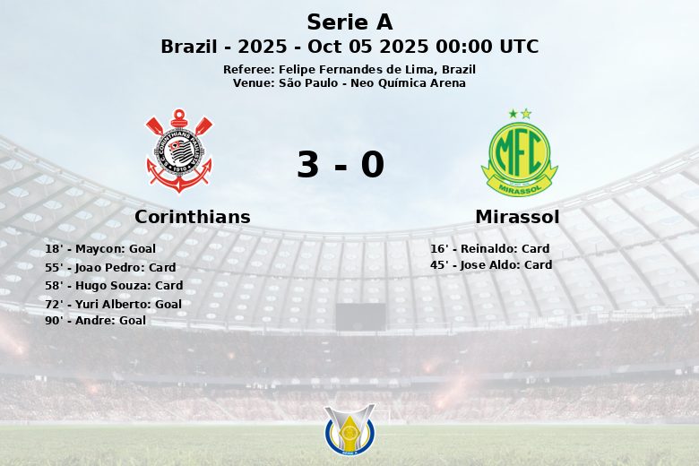The match opened with a penalty converted by Maycon in the 18th minute. Despite Mirassol’s attempts, which accumulated 20 shots, none managed to find the net. Corinthians, on the other hand, was more effective, with 3 shots on target out of a total of 10. The game was interrupted by a total of 33 fouls, with 19 committed by Corinthians and 14 by Mirassol, who also saw Reinaldo and Jose Aldo cautioned with yellow cards.