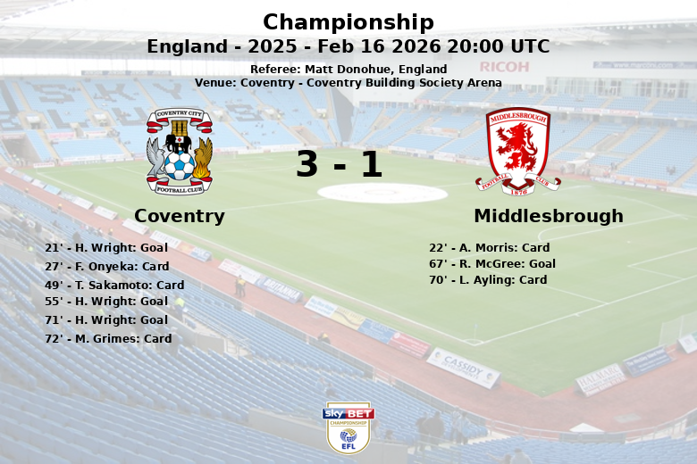 In the second half, Wright struck again in the 55th minute, this time assisted by C. Rushworth. Middlesbrough responded, pulling one back with a goal from R. McGree in the 67th minute. However, Coventry remained composed, with Wright sealing the victory with a penalty goal in the 71st minute, completing his hat-trick.