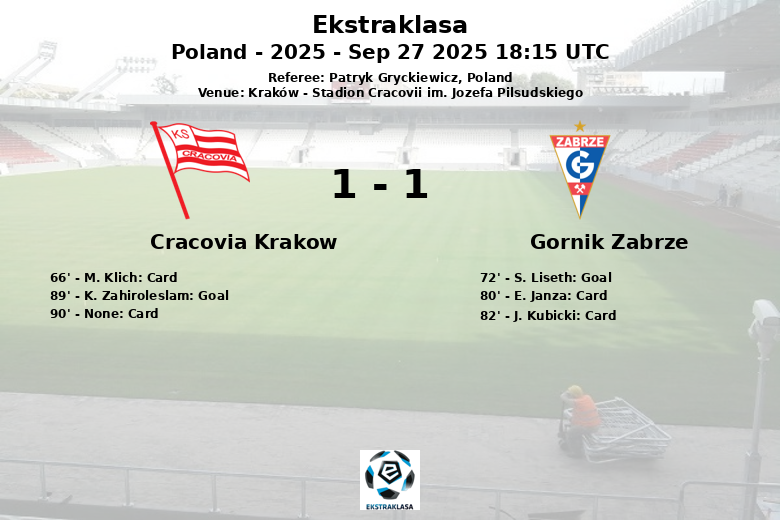 Gornik Zabrze, despite having less control of the game (37% possession), took the lead in the 72nd minute thanks to a goal by S. Liseth. Cracovia Krakow did not give up, and in the 89th minute, K. Zahiroleslam scored the equalizer that unleashed euphoria among the local fans. The match was marked by intensity, with several yellow cards shown to both teams (one for Cracovia Krakow and two for Gornik Zabrze) and a total of 14 fouls committed. Despite dominating possession, Cracovia Krakow had to settle for a point, while Gornik Zabrze takes home a valuable draw from their visit to Kraków. Polish referee Patryk Gryckiewicz was in charge of directing the actions.