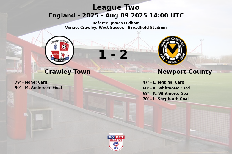 Newport County, despite having less possession (39%), was more accurate in front of goal, converting two of their six shots on target. Crawley Town, on the other hand, took 12 shots, but only one ended up in the back of the net. Referee James Oldham showed two yellow cards to Newport County.