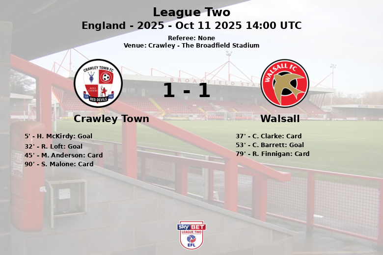 The score opened early when H. McKirdy, after missing a penalty, managed to assist and then score himself in the 5th minute. R. Loft extended Crawley’s lead in the 32nd minute, also assisted by McKirdy. Walsall, though with less possession (28%), managed to reduce the deficit in the 53rd minute thanks to C. Barrett, who received a pass from R. Browne.
