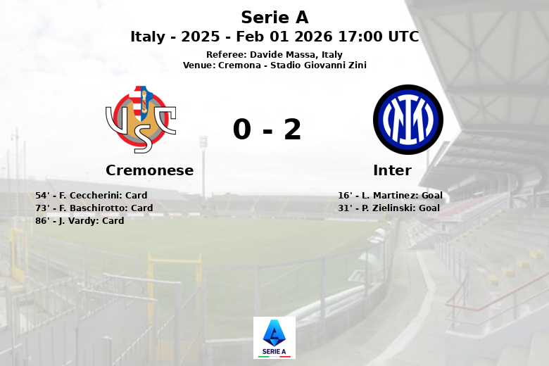 Cremona, Italy – Inter Milan secured a victory on their visit to Stadio Giovanni Zini against Cremonese in a Serie A matchday 23 fixture. The game, refereed by Davide Massa, was marked by Inter’s dominance in ball possession, reaching 69%, compared to Cremonese’s 31%.
