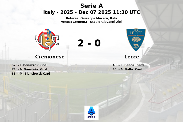 Cremona, Italy – In a hard-fought match at the Stadio Giovanni Zini, Cremonese defeated Lecce in a Serie A encounter marked by intensity and cards. Referee Giuseppe Mucera had a busy afternoon, issuing yellow cards to L. Banda and A. Gallo of Lecce, as well as M. Bianchetti of Cremonese.