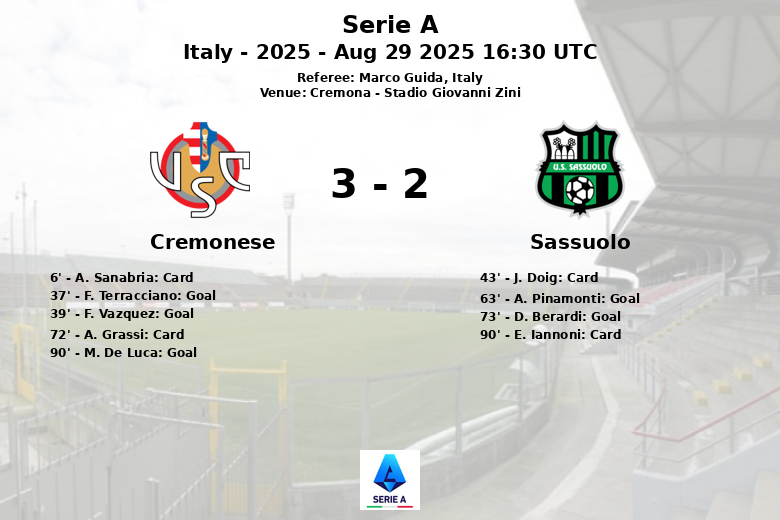Cremonese vs Sassuolo Aug 29 2025 16:30 UTC